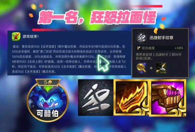 最后是狂怒拉面怪,只要你能拿到迅捷纹章,那么不论哪个英雄都能变身射手。当可酷伯装备迅捷纹章后,他技能的第二阶段的狂怒状态就能打出令人发指的恐怖输出,直接变身拉面师傅,不论目标是谁都难以扛过可酷伯的疯狂打击。