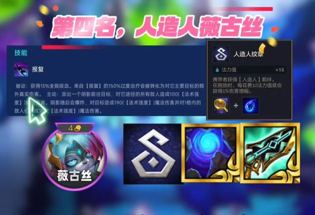接着还有人造人的薇古丝,大家知道薇古丝的法力值仅有30点,随便几下就能放波技能。而人造人提供的效果就是攻击后的回蓝,同时纹章还会给每使用10点法力增加1%伤害增幅的属性。所以薇古丝搭配这个纹章就非常合适,即便是4人造人羁绊也一样能让薇古丝实现点名效果。
