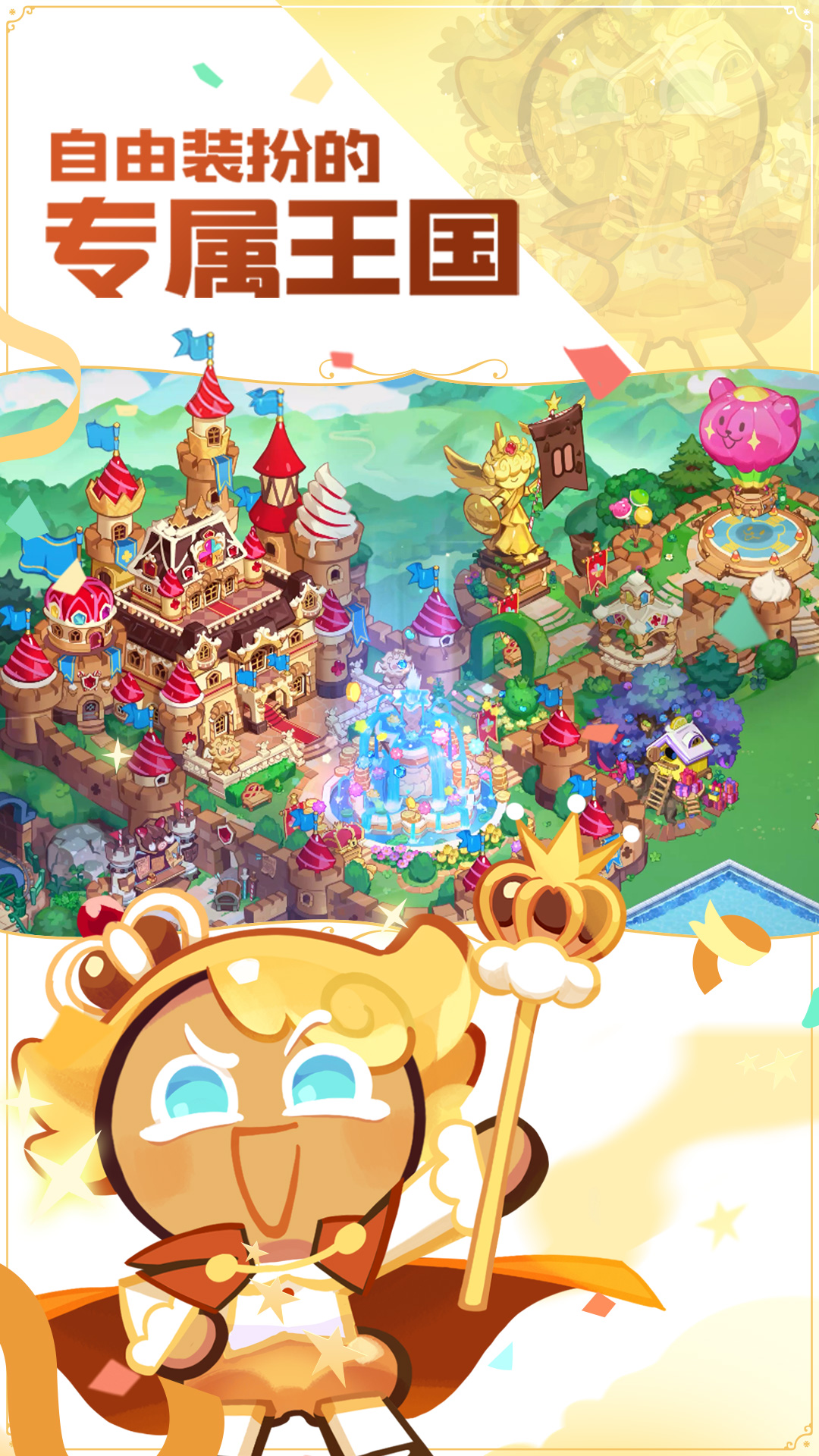 游戏的核心玩法之一是模拟经营。玩家将从一片荒芜的土地开始,亲手规划并建设属于自己的饼干王国。你可以建造面包坊生产资源,搭建糖果工坊提升科技,甚至设计专属的花园与广场来提升居民幸福感。每一栋建筑都采用精致可爱的卡通风格设计,支持自由摆放与个性化装饰。随着王国发展,你还能解锁主题皮肤,将整个领地装扮成冰雪城堡、热带海岛或复古小镇。这种高度自由的建造系统,让每位玩家的王国都独一无二,真正实现“我的世界我做主”。