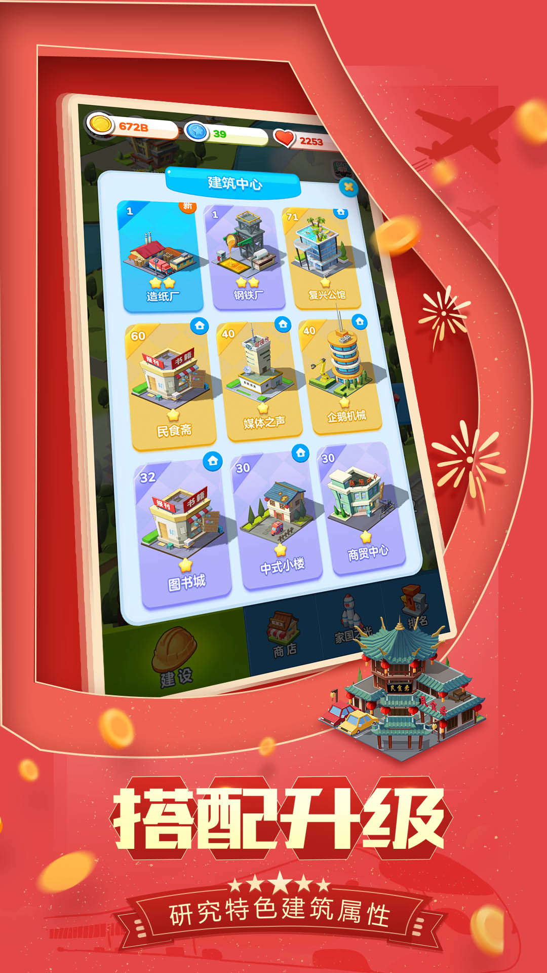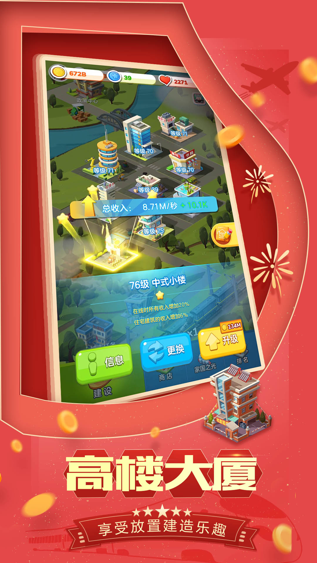 作为一款放置类建设游戏,家国梦在玩法上兼顾轻松与策略。玩家可以自由规划城市布局,建造住宅区、商业中心、交通枢纽、文化场馆等各类设施。随着等级提升,还能解锁地标建筑如港珠澳大桥、北京大兴国际机场等国家工程模型,极具象征意义。游戏采用自动收益机制,即使离线也能持续获得资源,适合碎片化时间游玩。同时,不同区域的发展节奏需合理调配,比如优先发展教育可提升市民幸福感,加强环保则能改善空气质量指数。这种轻度但富有层次的经营系统,既降低了入门门槛,又保留了一定的策略深度,满足不同类型玩家的需求。