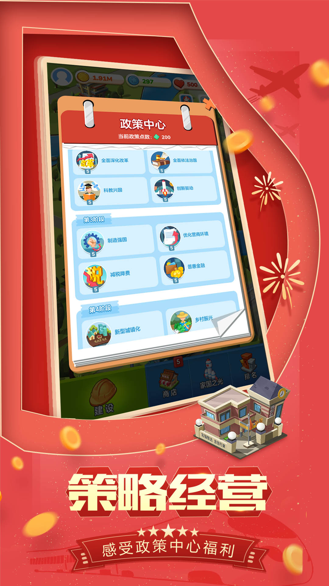 家国梦最独特之处在于其深度融入了真实国情与社会政策。游戏中,玩家需要通过合理规划城市发展路径,推动诸如扶贫攻坚、绿色出行、减税降费、乡村振兴等一系列国家战略落地实施。每一项政策的推行都会带来切实可见的变化:低收入家庭住进保障房,街道上共享单车有序停放,小微企业因税收优惠焕发活力。这些细节并非简单贴标签,而是通过可视化数据和人物故事呈现,让玩家在点击间理解政策背后的深远意义。例如完成“脱贫攻坚”任务后,原本偏远山村的孩子们会走进新学校,老人搬进安置小区,整个区域经济活力显著提升。这种将宏大叙事转化为具体行动的设计,极大增强了玩家的参与感与成就感。