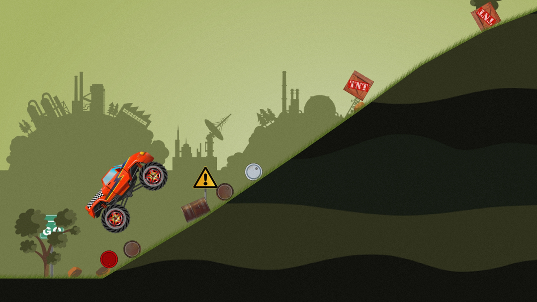 3、越过各种地形。玩家要控制车子爬坡或者下坡。这个操作,考验对油门的控制。路上会有坑,得找路线,有点考验技术。环境不仅仅是背景,也是玩法的一部分。