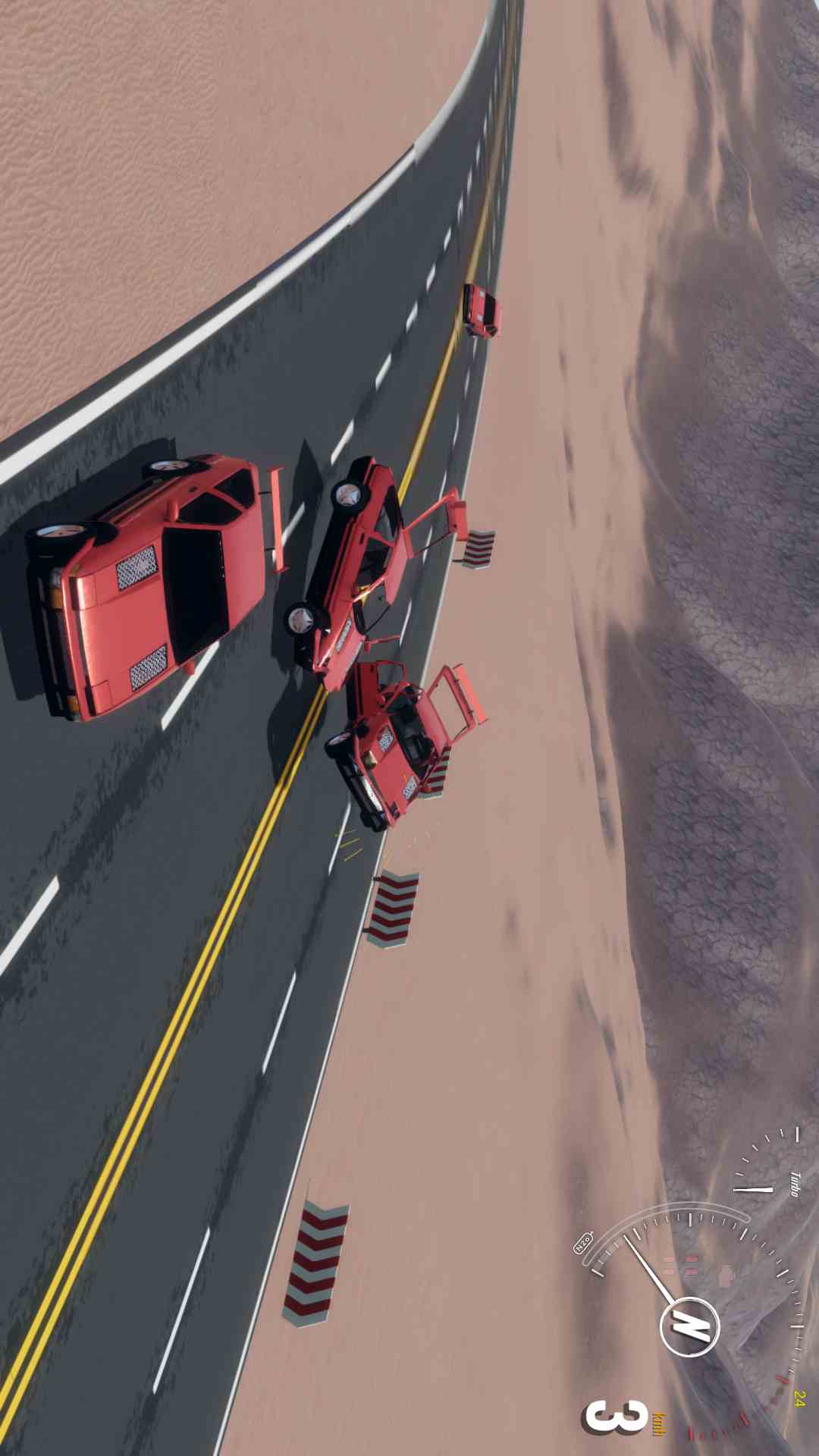 3. 随时都能体验热血的挑战。玩家在持续竞争中完成各种碰撞的关卡。车子损坏的程度会影响驾驶。玩家需要注意保护自己的车辆,不然很难开到终点。