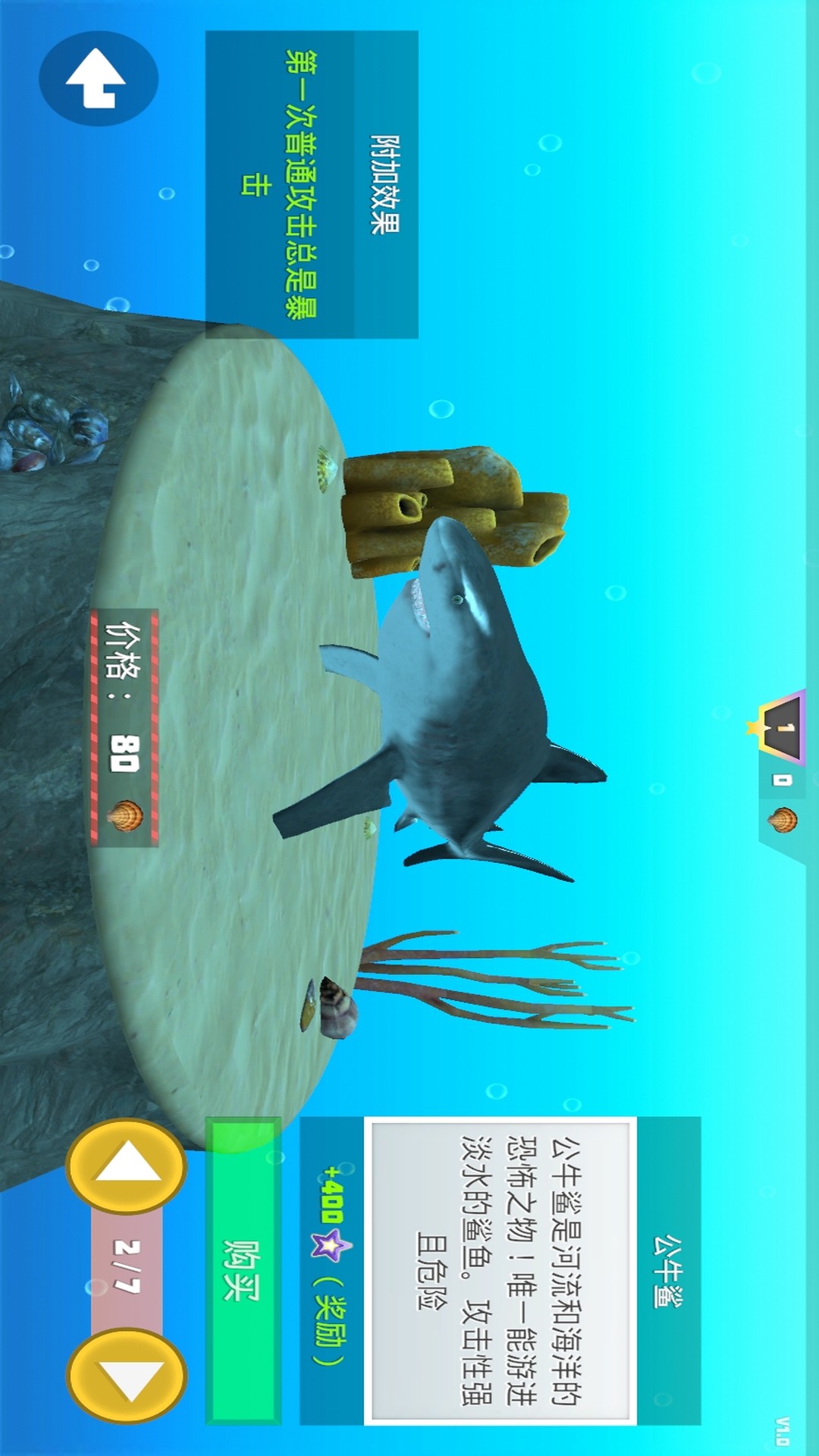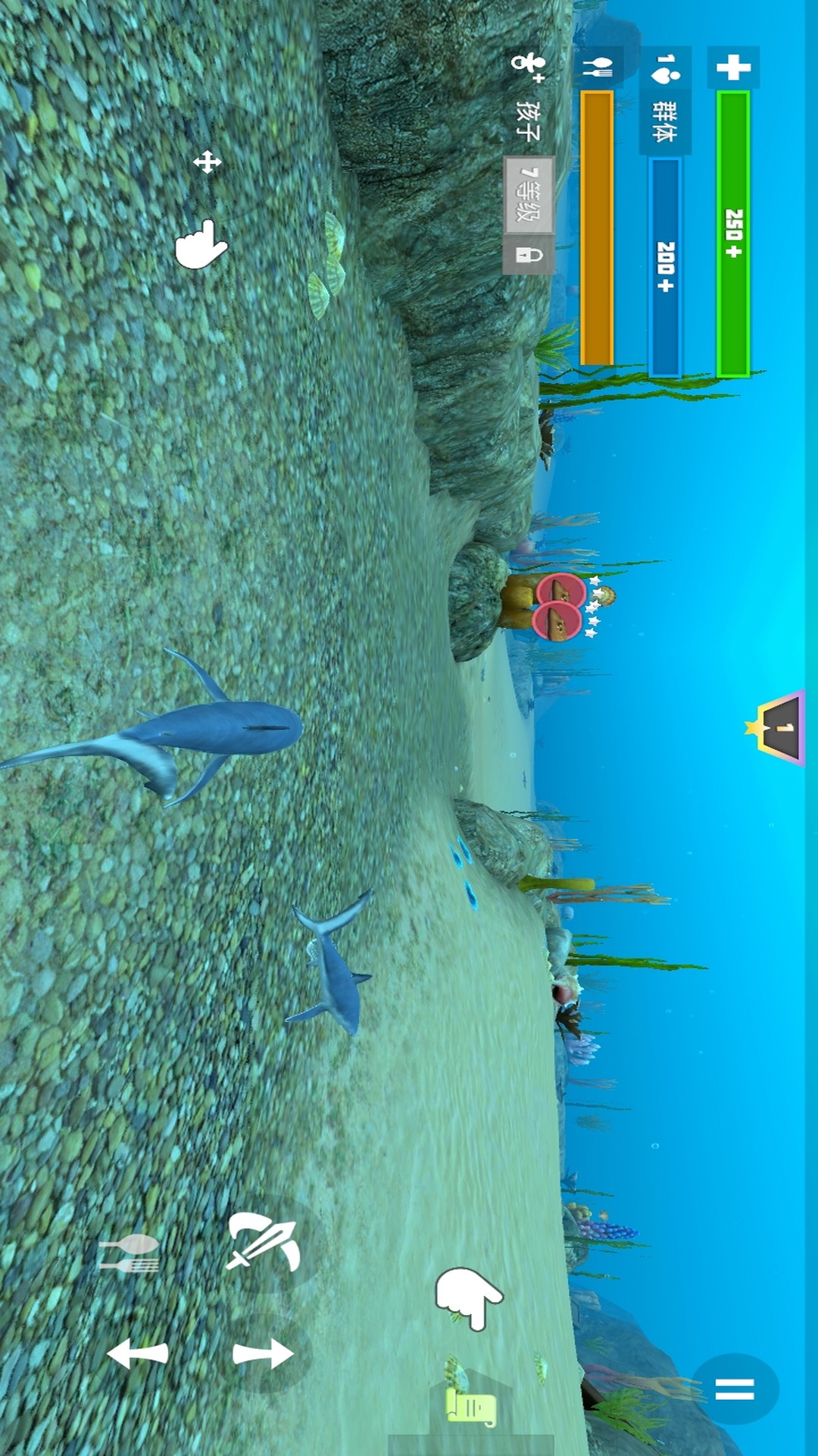 1、尾鳍游动控制。屏幕上有虚拟按键,控制方向很简单。这个设计,新手玩家也能马上上手,不需要练习很久。操作起来,比较流畅。