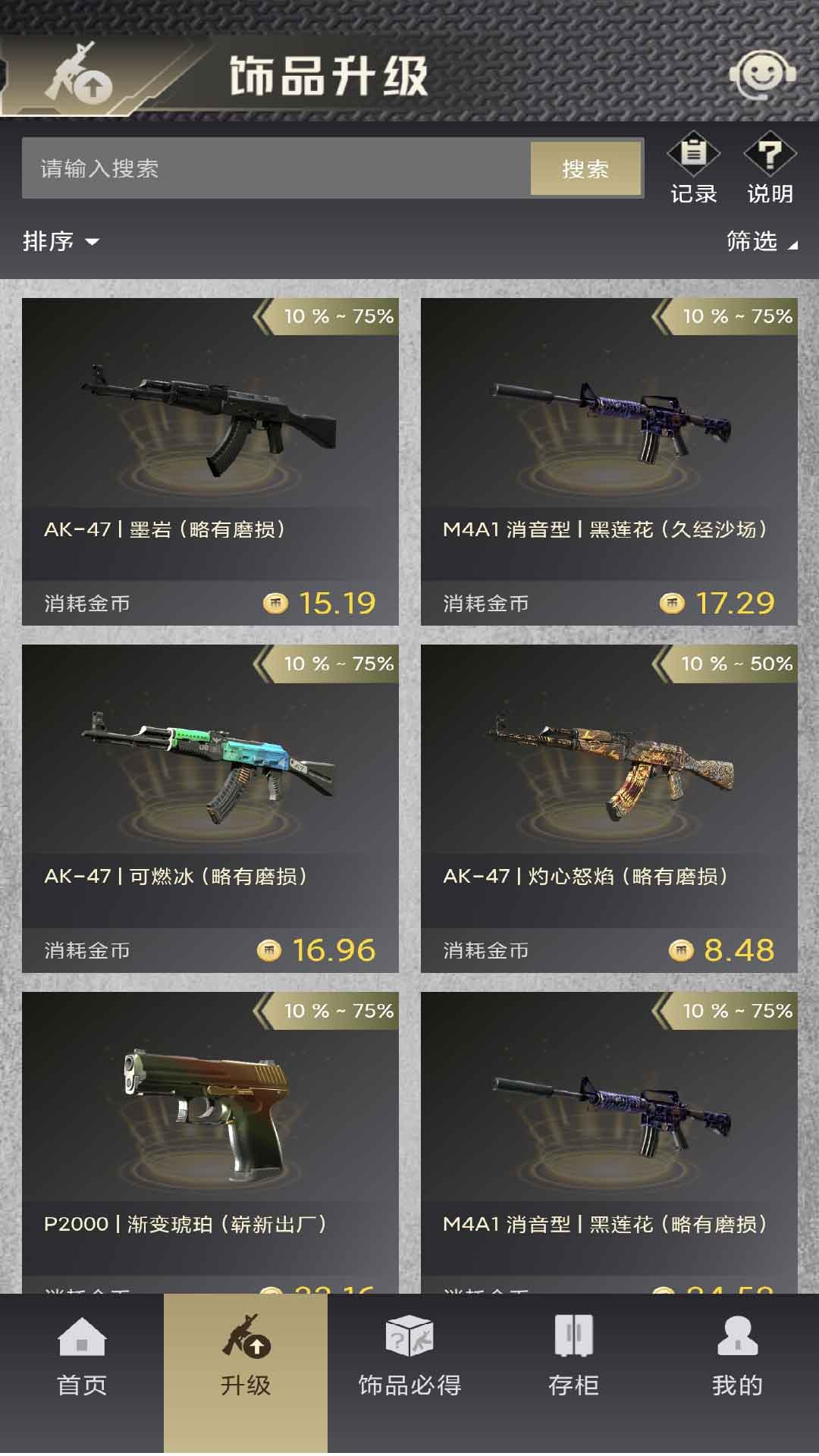 2、饰品升级。耗金币就能发起升级,规则和结果说明也是公开的,用户知道怎么玩,结果咋样心里有数,不会觉得被坑,流程也很清晰。